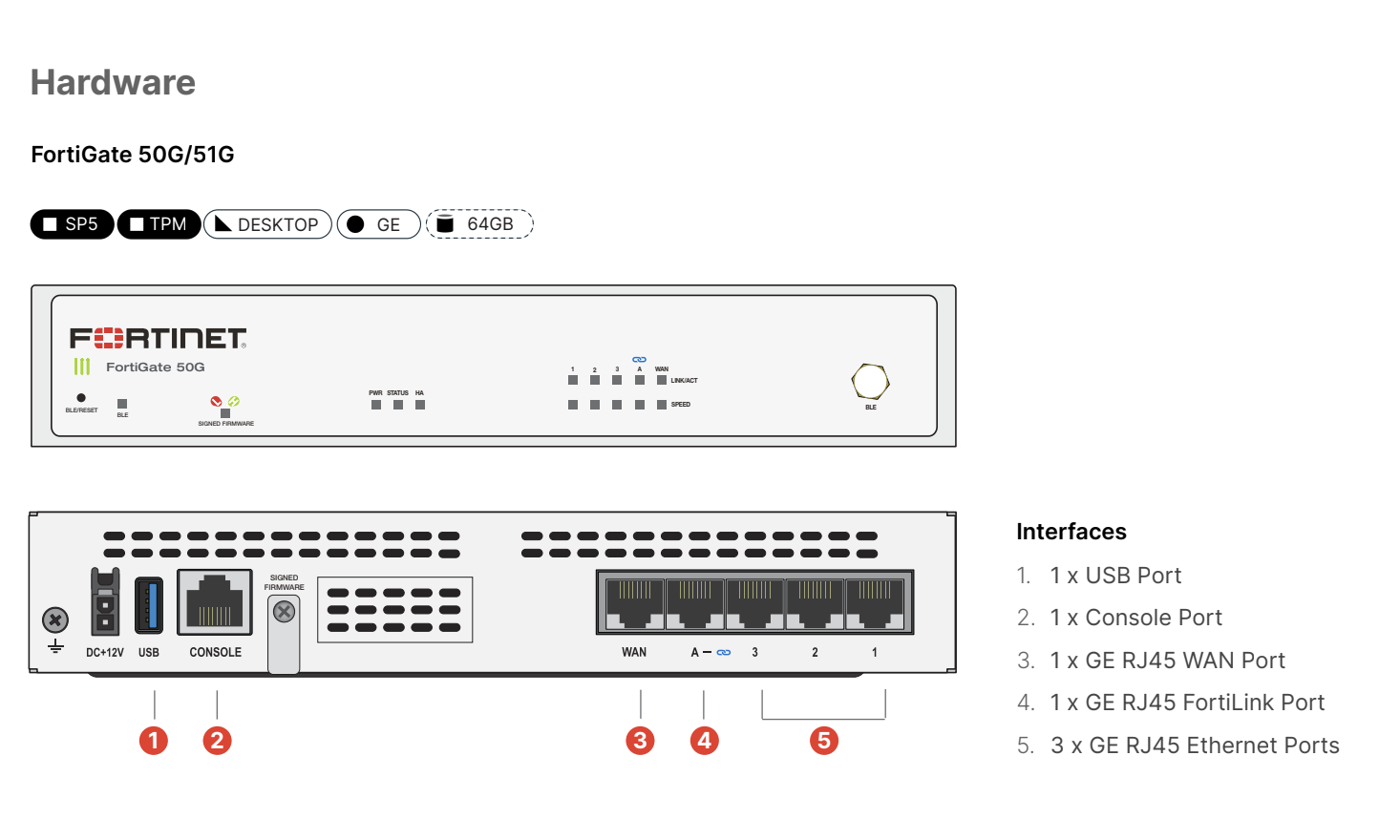 - 5 puertos GE RJ45 (1 WAN, 4 internos/FortiLink).